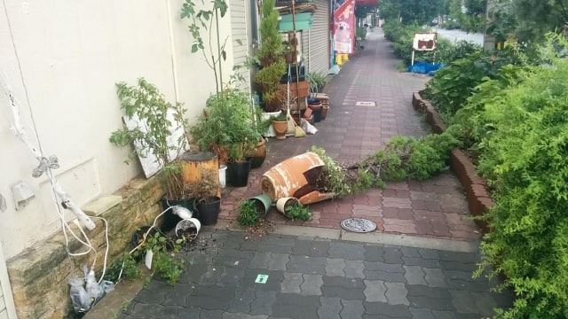 台風が近づいているときは、庭やベランダの植木鉢が倒れる可能性があります。